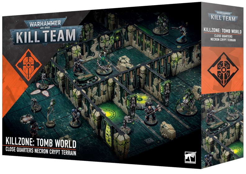 Box mit einer beidseitig bedruckten Geländekarte und viel Gelände Teilen im Necron Stil.