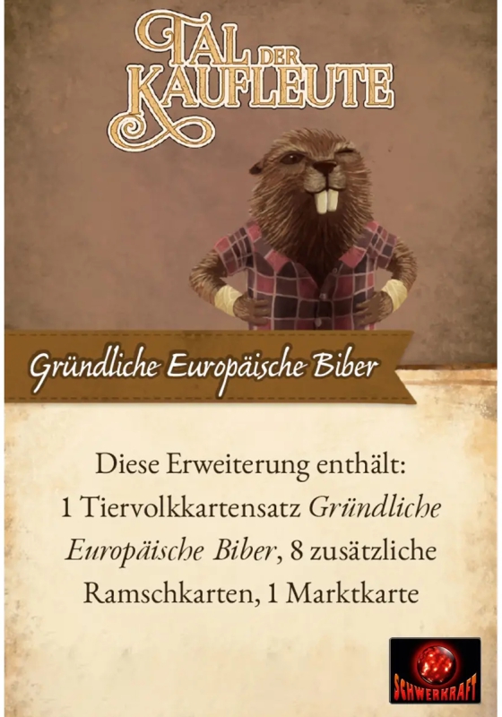 Tal der Kaufleute: Europäische Biber ist eine Mini-Erweiterung für Tal der Kaufleute oder Tal der Kaufleute 2. Sie enthält ein komplett neues Tiervolk: Gründliche Europäische Biber. Dieses Tiervolk richtet sich mit seinen Strategien an erfahrenere Spieler.